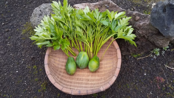 明日葉は伊豆諸島特産の野菜です。お浸し・ツナマヨ和え・天ぷら・サラダ・汁の具などに。