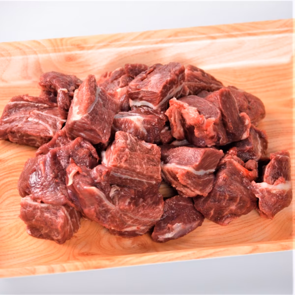 このお肉は、牛のホホ肉です。3~4センチ角のサイコロ上にカットして、煮込み料理に使いやすい形でお使いいただけます。カレーや赤ワイン煮込み、醤油や味噌をベースに煮込んでも美味しく召し上がっていただけます。
