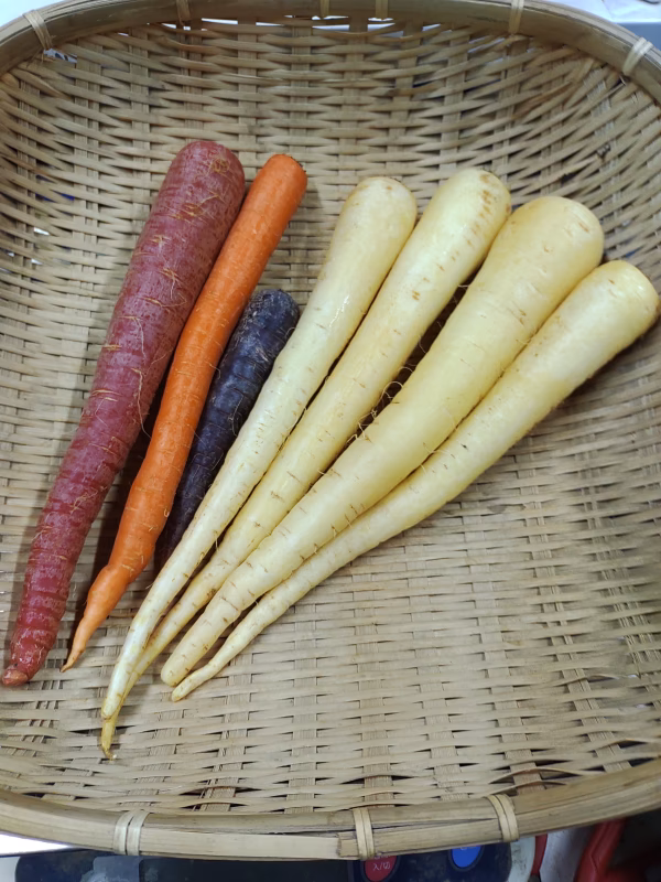 丹波黒大豆やお酒が美味しい兵庫県「丹波」市で、農薬・化学肥料・除草剤・動物性肥料を使わずに旬の野菜を年間100種類以上栽培している『なゆた農場』の白人参とカラフル人参の詰め合わせです。