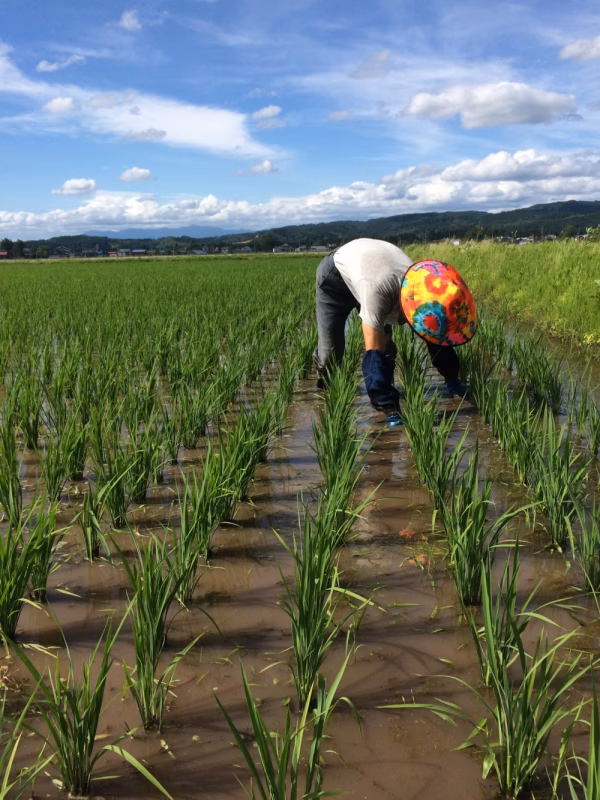 玄米は、農業・化学肥料・除草剤不使用で田植え後、田んぼに入り除草作業をしています。