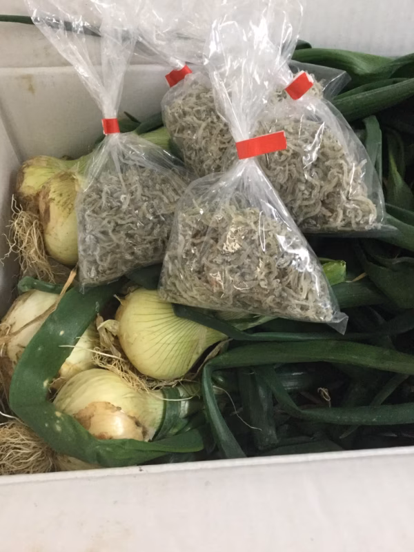 広島県最南端のちりめん屋です!の新玉ねぎご興味を持っていただけてるようでありがとうございます ちりめん屋さんなので ちりめんも入りませんかということで 訳あり50gの小袋なら すみっこなどに詰めらそうということでやっとみました(*^▽^*)できた玉ねぎ減らさず スキマにちりめん4袋200g 入りましたー ただ要注意到着後ちりめんは冷蔵庫で保管ください 玉ねぎ説明はこちら 農家さんの多いポケマルでも稀!新玉ねぎ 玉ねぎ=淡路島のイメージですが2年ほど前から 瀬戸内の島の新玉ねぎにも注目が集まってます! というのも島の急傾斜の石垣段々畑に育つ新玉ねぎは 太陽の光 海からの光をうけ 更に石垣があったかい熱を保ってくれ 砂地の上に、石垣でしっかり無駄に水分を貯えない! 玉ねぎ野育つ土地は海の潮風が当たるため 海水のミネラルたっぷりの土壌! これは作物を育てるのがなかなか難しいのですが おいしい栄養をしっかりとって 玉ねぎの甘み、旨みになってます 通常は葉っぱを切ったり根を切って乾かして出すのですが 石野さんも考えた。 私たちが今、美味しいと思うのは??? ポケマルならではの特別 新鮮な葉つきのまま!畑から直送どうでしょう? というのもこの葉がまたおいしい! さらしネギににしてねぎのようにたべてみてください! 肉じゃがにしたら玉ねぎは溶けてなくなるので おい玉ねぎもオススメ コクも甘みも違います 80サイズ出送れる箱(正確には78センチ)いっぱいでお届けします 葉玉ねぎというと玉ねぎの玉は小さいものともいますが 写真の通り、葉つきでもしっかりした玉、重さもあります。 無理に栄養をやって大きくしたのではなく 石垣段々畑!ここに太陽さんさん、海の光もさんさん 石垣の熱でしっかり守って そこにかけるのは手間と愛情、 密集した玉ねぎの間に生える雑草をこまめに抜きます 玉ねぎにしっかり栄養が行きます。 ふわふわではなくしっかり実の詰まった瑞々しい 玉ねぎまずはサラダで、 葉つきなので肉じゃがを作れば彩もばっちり 新鮮なままお届けで葉もさらしねぎにしたら最高 あますところなく食べていただけます。 ちりめん 表記 カタクチイワシ(広島県) 食塩 要冷蔵