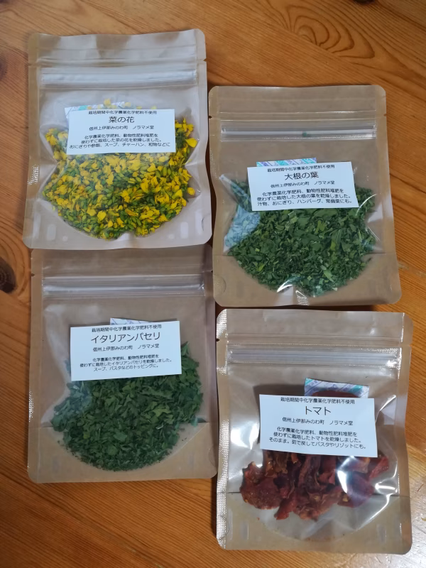 化学農薬、化学肥料はもちろん、動物性の肥料や堆肥も使わずに栽培しています(表示は栽培期間中化学農薬化学肥料不使用となります)。製造(乾燥)は野菜により天日、機械と野菜により使い分けておりますが、最終的には天日乾燥の物も機械に掛けてしっかり乾燥させています。