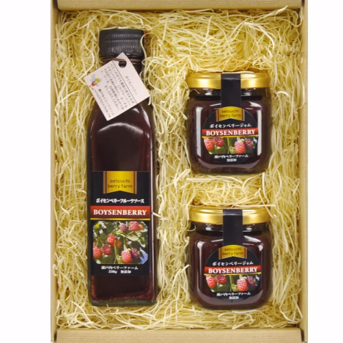 賞味期限が4か月以内となったボイセンベリーフルーツソースとジャムの詰め合わせです。