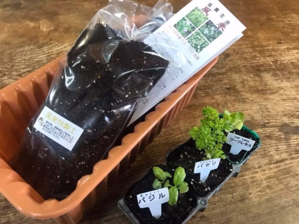 代表的なハーブ苗(バジル・リーフレタス・パセリ)にプランターと特製の土、プランターまでセットになってます。