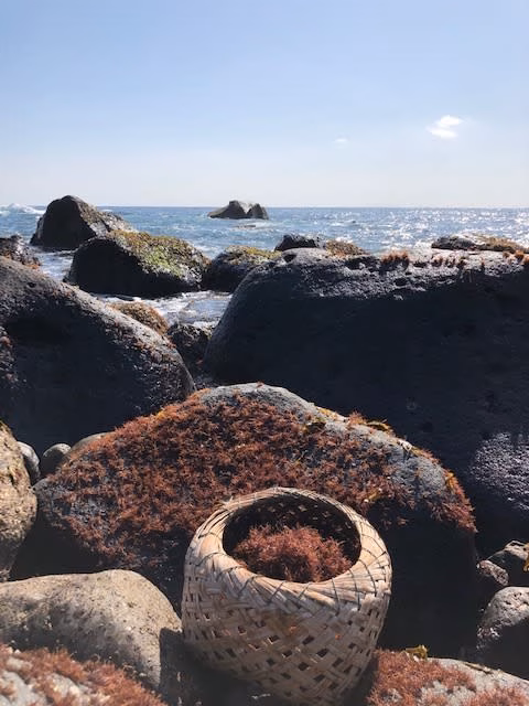伊豆の綺麗な荒磯で採れた新鮮でおいしいふのりを送ります、漁の合間にとる布海苔です。 3月後半に磯で取った物です、採ったばかりの布海苔を天日で干しあげます、その後梱包しています、全て手作業の味の濃い海藻です。