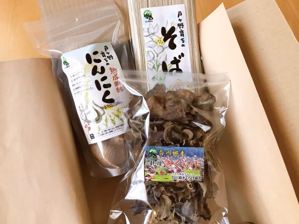直売所「長助」で販売している白川郷産品、甘くて食べやすい黒にんにくとお蕎麦、乾燥きくらげをセットにしました。ドライフラワーを添えてお届けします⭐︎
