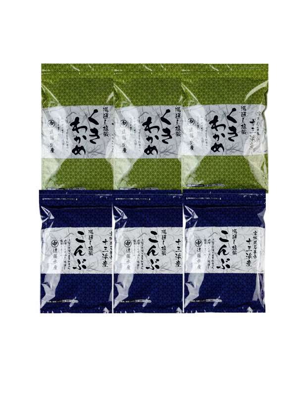 - ●茎わかめ 名称:湯通し塩蔵茎わかめ 原材料名:わかめ(十三浜産)、塩 内容量:400g ●こんぶ 名称:湯通し塩蔵こんぶ 原材料名:こんぶ(十三浜産)、塩 内容量:300g 製造者 宮城県石巻市北上町十三浜字大指89-2 ㊥マルナカ遠藤水産 遠藤俊彦