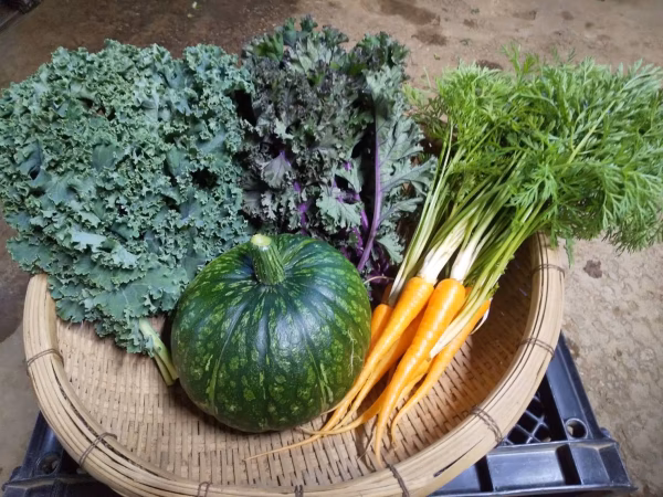 春かぼちゃ1個、葉付きにんじん、フリルケールヴェルデ、フリルケールロッソ、ほうれんそう、春菊、スイスチャード、ニラ、ゴーヤの中からの組み合わせで、クール便にて発送させていただきます。