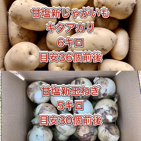 鹿児島産の新玉ねぎ5キロ前後、新じゃがいも6キロ前後注文を受けてから、収穫日に収穫した箱込み11キロ前後を畑の空気も収穫しながらAB品大中小混合箱詰めして、当日発送します^_^