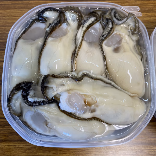 出荷前に殻付きで生きたまま滅菌海水に浸けて48時間不純物を吐かせてから剥き身にしております。