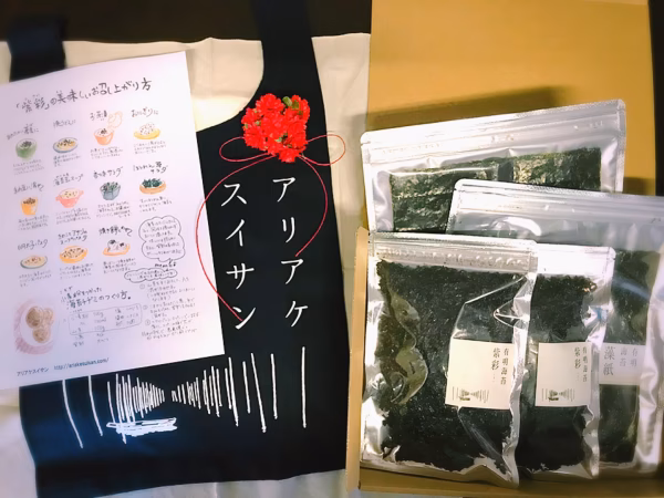 アリアケスイサンのマルシェバッグと、『有明海苔 紫彩』2袋、『有明海苔 藻紙』2袋の有明海苔セット、いかがですか。