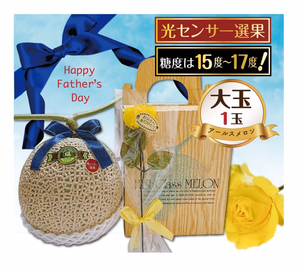 リボン、黄バラ(造花)、シールで飾り付けした父の日ギフト用のアールスメロンを数量限定で販売します。お届けは6/18~20でご指定希望があれば連絡頂ければと思います。またメッセージカードの希望もありましたら連絡下さい。発送を6/17から随時行いますので、受付期限6/15までとします。糖度は最新の光センサーで測定し15度以上のもの、大きさは3Lサイズ2キロ以上のメロンをご用意いたします。数に限りがありますので、お求めの方はお早めにご注文頂けますよう宜しくお願いいたします。
