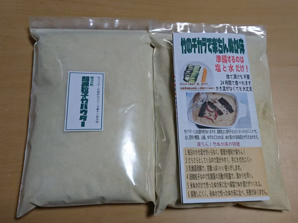 実際に竹パウダーを焙煎して抽出したお茶なども製品化されていて、いろんな効果がお客様の声として小K際されています。また、乳酸発酵させた竹パウダーをぬか床として使用して漬物も作ることができます。