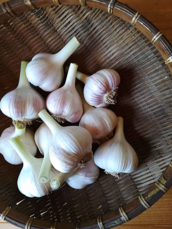 一般的に売られているニンニクと違って、水分たっぷりで瑞々しく、辛味や香りが柔らかで、とても甘いです。