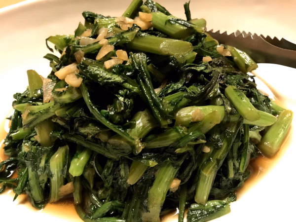 春菊:流水で洗って泥などを落とし、茎の太い部分とそうでない部分に分け、食べやすい大きさにします。
