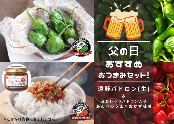 昨年も人気だった父の日限定の「遠野パドロン&遠野レッドパドロン入り旨辛おかず味噌」のセットが、今年は小容量セット~大容量セットまで登場!別々でも、一緒に料理にしても楽しめる”ビールもごはんもすすむ”セットです♪小容量のみ【自宅用】【父の日ラッピング】がありますので、お選びくださいませ(^^♪