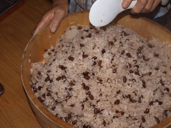 赤飯を作る際の餅米とササゲ豆の割合は、おおよそですが、餅米三合 : ササゲ豆100gとなります。米と一緒に豆を炊く前に、ササゲ豆を水漬け、柔らかくなるまで煮て下さい。