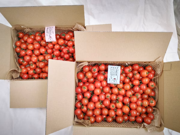 ダンボール箱にバラで詰め、ガムテープで梱包します。箱内の緩衝材は紙を使います。一般的にスーパーで販売されているミニトマトが170から200gなので、ミニトマトパック13~15パック分に相当します。完熟一歩手前で収穫しますので、お手元に届くころには完熟になります。25度以下常温保存で5日間、18℃以下冷暗所保存で7日間、冷蔵庫保存で10日間がお召し上がりいただける目安です。