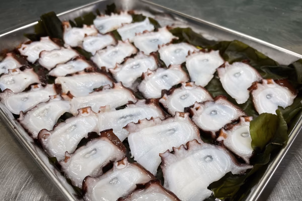 自分でも昆布〆は初めてで、うちの港は茹でタコ自体が有名なのでそれ以上のものはない!と決めつけていたのですが、ちょっとしたキッカケがあって新しい事にチャレンジしてみようと思い、思いついたのが『茹でタコの昆布〆』でした。