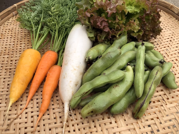 自然栽培で育てたソラマメ1kgと露地野菜3種類が入った野菜セットです。(露地野菜の写真は一例です。)