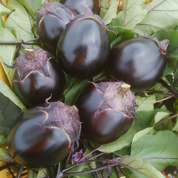 大和の丸ナス 肉質がずしっと締まってジューシー 焼き、炒めにオススメですが、中身をくりぬき器としてナス、トマト、チーズを盛り付け、オーブン焼きで頂くとスープまで美味しくお楽しみ頂けます。