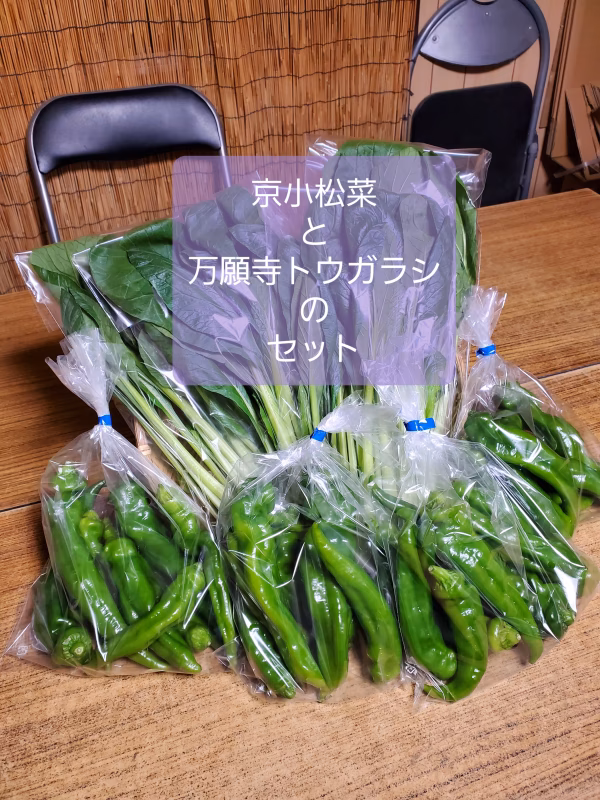 京の伝統野菜万願寺とうがらしと京小松菜の セット。 万願寺とうがらしは曲がった果実やまっすぐな果実が曲がったものとなります。