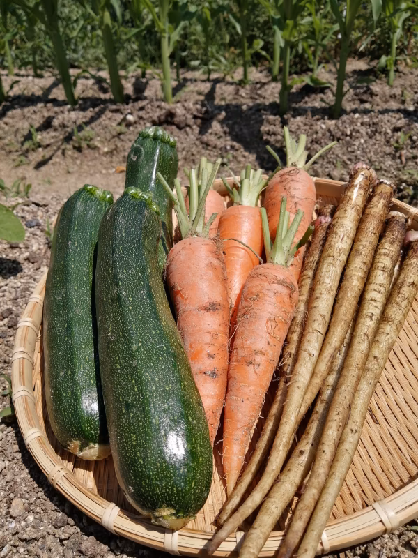 ごぼうは長さが短めの品種で、とても柔らかく美味しいです。ズッキーニも太陽の恵みをいっぱい浴びてすくすくと大きく育っています。にんじんも掘りたて新鮮で甘みたっぷりです。