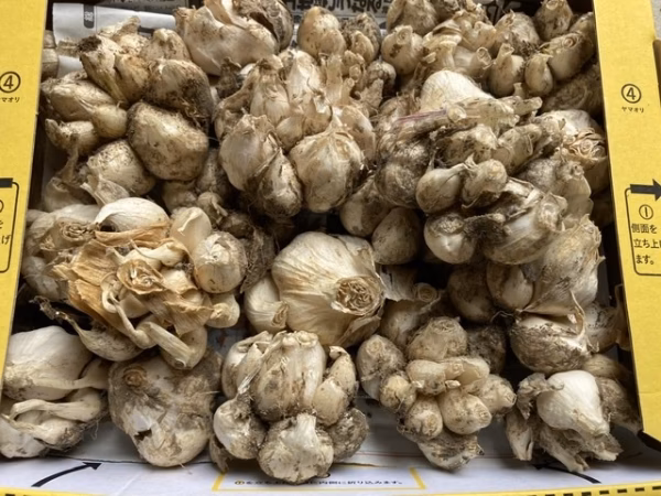 写真の通り、「泥付き」・「形が悪い」・「大きさ不揃い」の3点です。当ニンニクは、球が開き過ぎた規格外品扱いですが、味は普通のニンニクと変わりません。