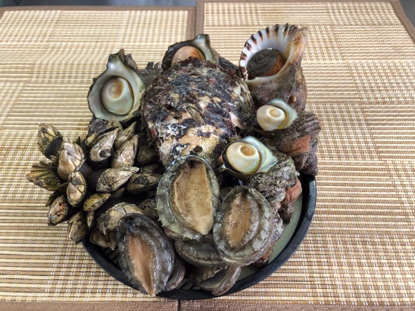 内容は志摩の海で取れた、天然の岩ガキ、トコブシ、サザエ小サイズ、サザエ中サイズ、サザエ大サイズ、ホラガイ、カメノテ等です。