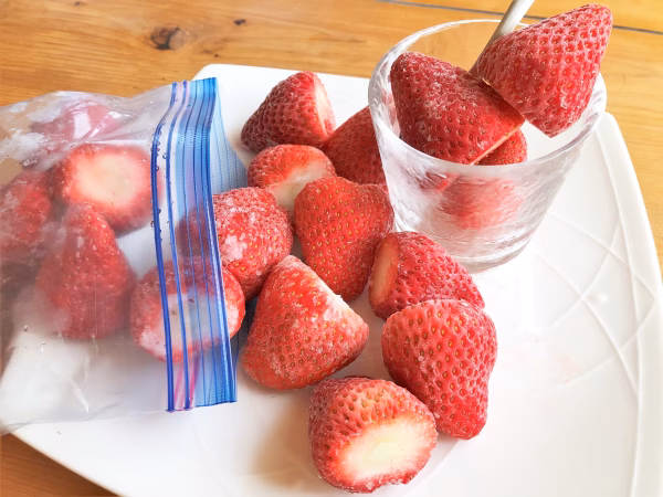 真っ赤に完熟した粒だけを朝採りして、数時間以内に急速冷凍した冷凍イチゴです。