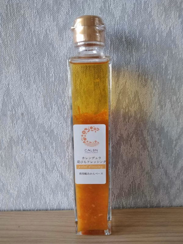 南房総産のみかんがベースになっているので、ドレッシング全体がオレンジ色。サラダにかけると、カレンデュラの花びらも広がり、オレンジ色が映えてきれいです。