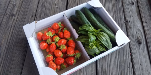 [完熟🍓やよいひめ]と🥒朝採りきゅうり、摘みたてバジルの詰合せです。