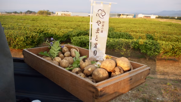 じゃがいもを育てている地区はかつては痩せ地でした。江戸初期から茶を作り始め、蚕を育てていたんです。そんな中野菜は根菜類を中心にじゃがいもを作っていました。この地区に居る方全てのお婆さん、お爺さんは『ここのじゃがいもはひと味違う』と常日頃からお話ししていました。2年前に農地を借りられることになり農園で採れる作物のほとんどは常に私達も初めて食べるもの。{ほんまかなぁ?}と疑問を抱きながら、実際作って見たところ、ひと味違うじゃがいもになりました。『ほんまやん!』 じゃがいもの特性が引き立ち、ホクホク、しっとりとした食感。中でも土の香りがするじゃがいもです。