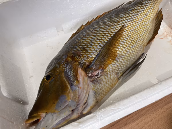 素潜りでの魚突きで捕獲しています。常に頭、エラ付近を狙うように意識していますが、体に撃つ事もあります。