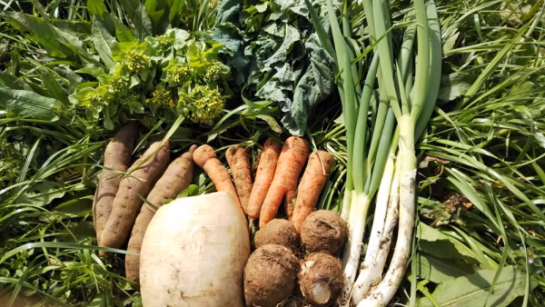農薬肥料不使用、耕さない、草や生きものたちの中で育った四季折々の野菜たちです。