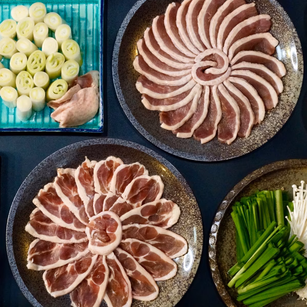 山形県新庄市の新庄駅にある直営店 鴨料理と十割蕎麦かもんの鴨すき焼きセットです。卵と甘辛のすき焼きのたれに絡む最上鴨の和牛に負けない旨味をご体験ください。