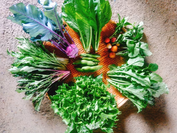 農薬・化学肥料を使わず、やさいの育つ力にそっと手を添えるイメージで育てたげんたのやさい。その時期に収穫できるもののなかから6~8種類を選んでお届けいたします。