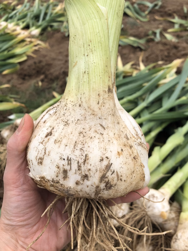 今回は乾燥させる前のとってもジューシーなジャンボニンニク。鮮度を保つため根っこと土が付いた状態での発送となります。根っこの太い部分はきんぴらにすると美味しいですよ♪