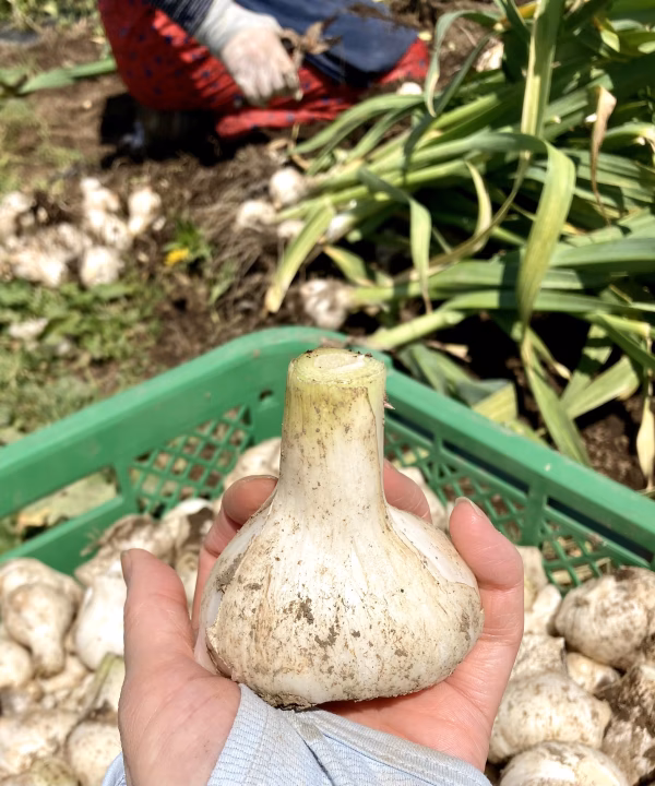 農薬を使わないため、病気や虫が付かないように収穫1ヶ月半ほど前から毎日畑の見回りをして大切に育てた可愛いジャンボニンニクたちです。