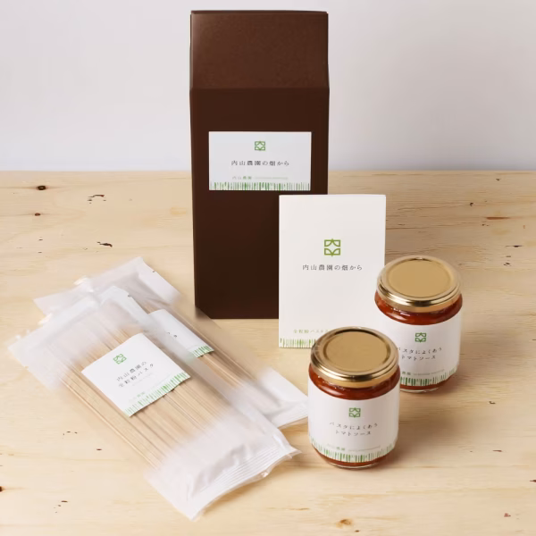 その小麦を100%使用した全粒粉のパスタ麺と、無農薬で育てたトマトで作る無化学調味料・無添加物のトマトソースをセットにしました。