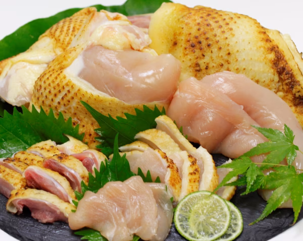 鶏刺し用に皮目を炙った鶏肉です。使いやすいように小分けに真空パックしています。