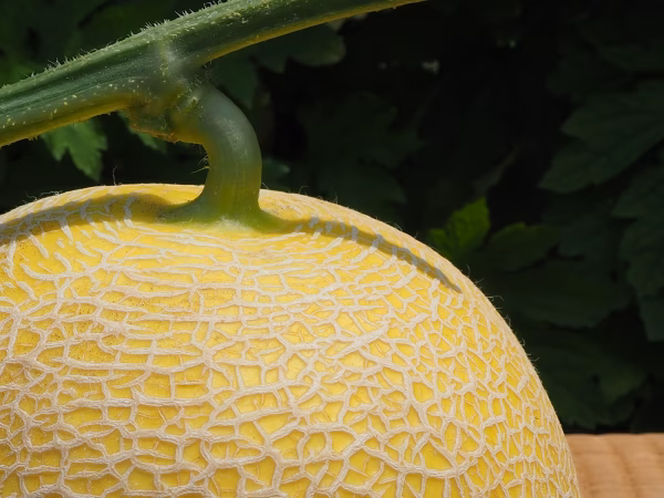黄いろの果皮に白いネットが入る、華やかな雰囲気のメロンです。果肉は黄緑色をしており、カットすると果皮とのコントラストが爽やかで、見た目にも楽しめる品種です。糖度が高く、食味のよいメロンです。