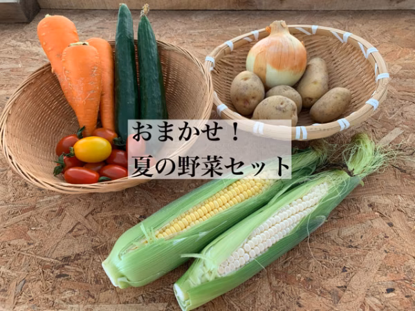 玉ねぎ、人参、きゅうり、トマト、ミニトマト、トウモロコシ、白トウモロコシ、ズッキーニ、ピーマン、なす、枝豆、大葉、にんにく、いんげん、オクラ、かぶ、など