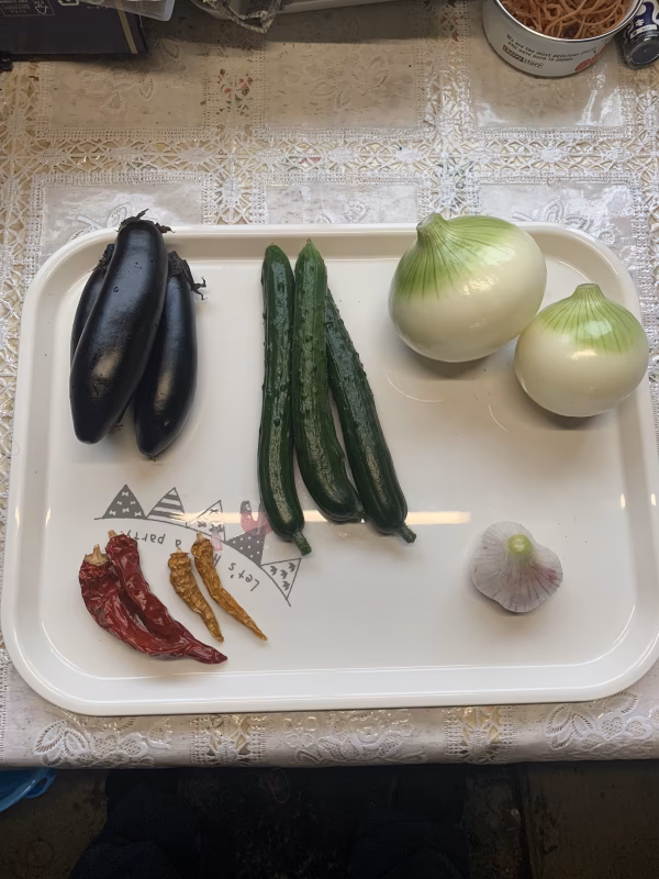 最上赤ニンニク1個、茄子3個、きゅうり3本、玉ねぎ2個、激辛赤唐辛子2本、激辛黄色唐辛子2本とアスパラガス