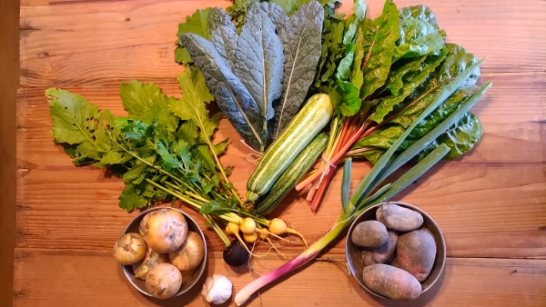 品目例:淡路島玉ねぎ、ケール、ズッキーニ、スイスチャード、小カブ、葉付き人参、ビーツ、にんにく、長ねぎ、新じゃがいも、四葉きゅうり、などから7〜8品。