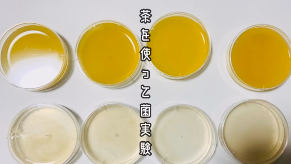 お茶を混ぜた寒天培地と混ぜていない培地にヨーグルトや、手指、納豆、ブルーチーズなどを付着させます。
