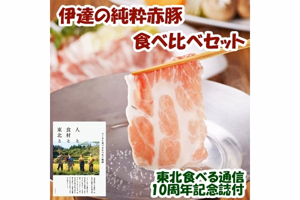 赤豚のお肉と東北食べる通信10周年記念誌「人と食材と東北と」をセットでお届けします。