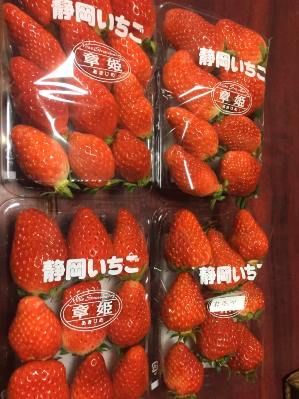 紅ほっぺ、あきひめともに静岡で作られた伝統的な品種で紅ほっぺは糖酸バランスに優れた大粒のやや硬い品種で断面が美しくスイーツなどに最適です。あきひめは甘く柔らかい果肉で生食でたいへん美味しく召し上がれます。一方、その柔らかさゆえに完熟した品の市場流通はたいへん困難で静岡以外でみかけることは少ないと思います。