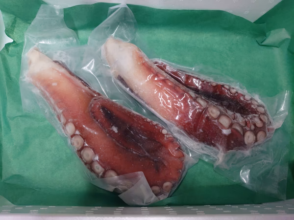 タコ箱漁で水揚げされたタコを即浜茹でし、真空パックをして急速冷凍しています。