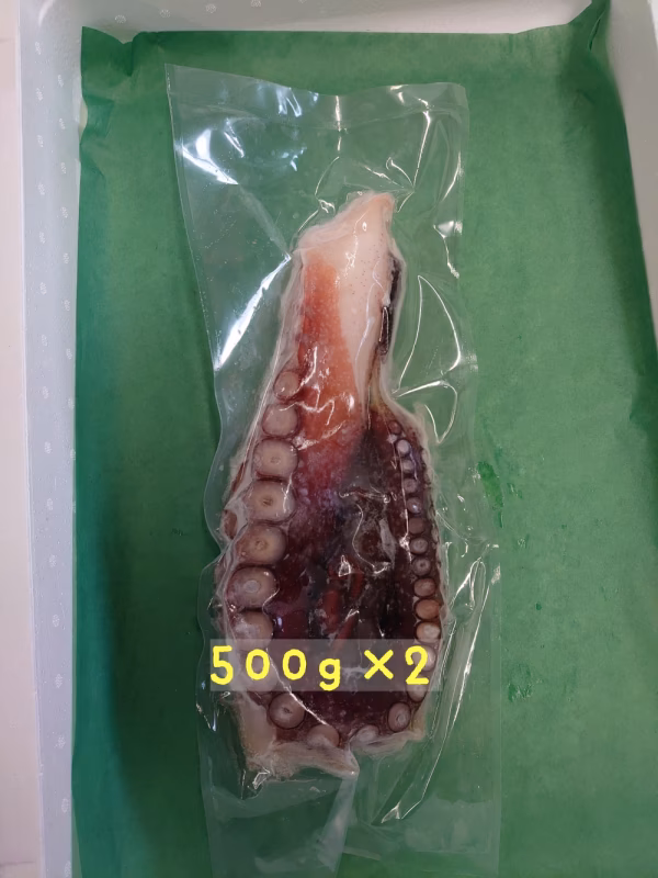 タコ箱漁で水揚げされたタコを即浜茹でし、真空パックをして急速冷凍しています。